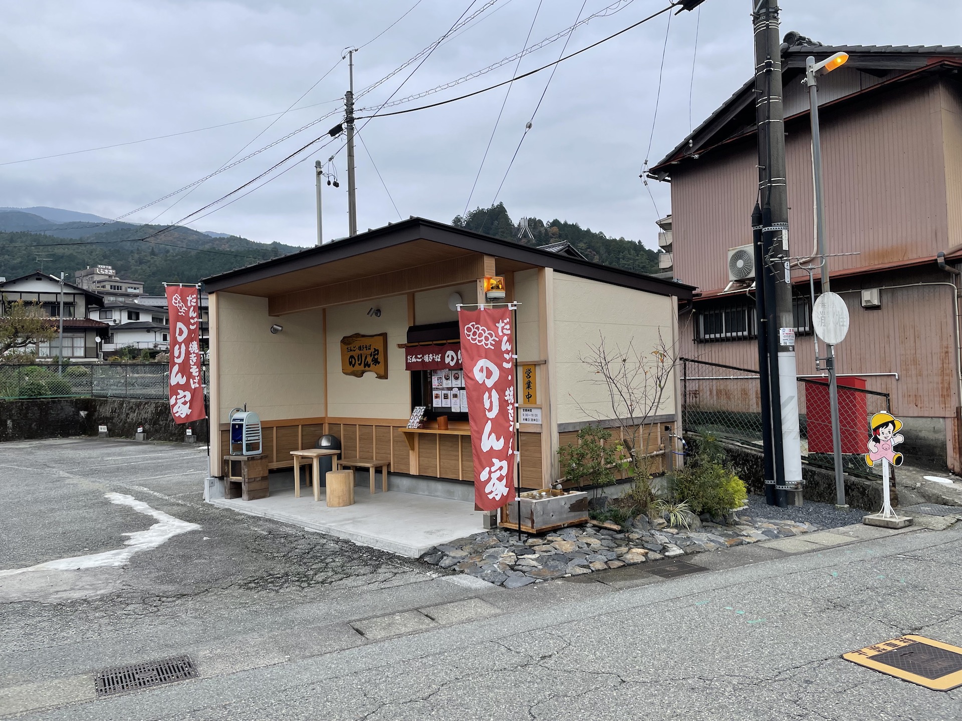 下呂温泉の食べ歩きというと、牛の握りや、牛串と飛騨牛が多いですが、団子や五平餅もいただけるお店ができました。温泉街のある川沿いから少し入ったところにできた団子屋「のりん家」をご紹介します。桶型の展望台がある「ふれあい広場」のすぐ近くです。珍しい「えごま」のタレが、とても美味しいんです。