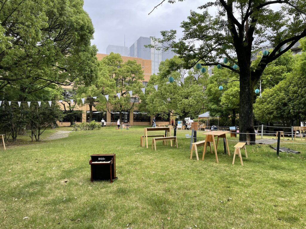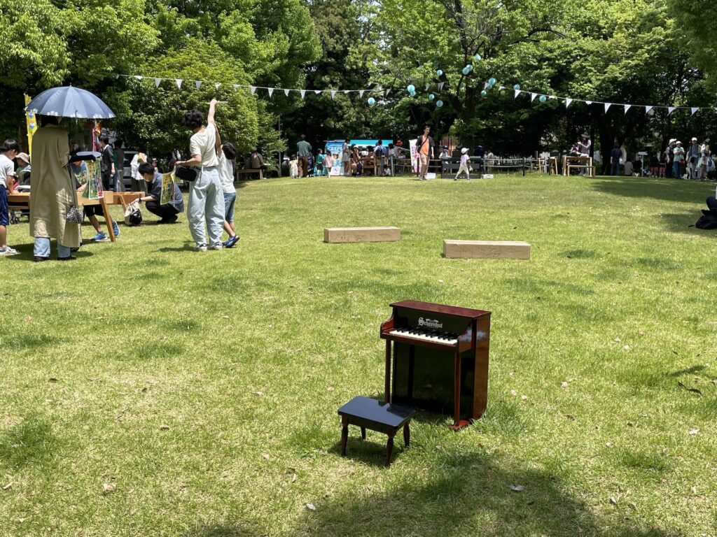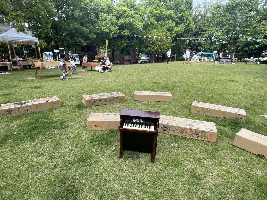 芝生広場には、ウーーノはここだよと看板があったので、こちらで演奏。向かい側にはみんなのデザインが施された座れる箱が置いてありました。ポカポカ陽気でよかった!