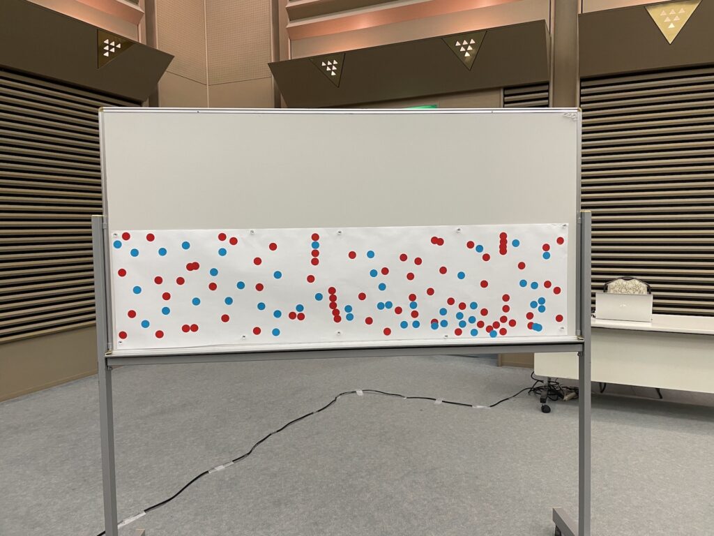そして、今度は、みなさんに楽譜を用意していただきました。それが、ホワイトボードに貼られた赤と青のシールです。このシールたちを楽譜に見立てて、ウーーノが即興演奏しました。