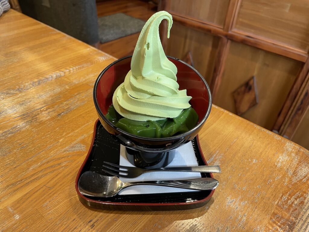 抹茶のソフトクリームが乗った、ババロアをいただきました。似たもので抹茶プリンにソフトクリームが乗ったものもあります。抹茶ソフトは、抹茶の苦味や旨味が感じられ、上品な甘さです。