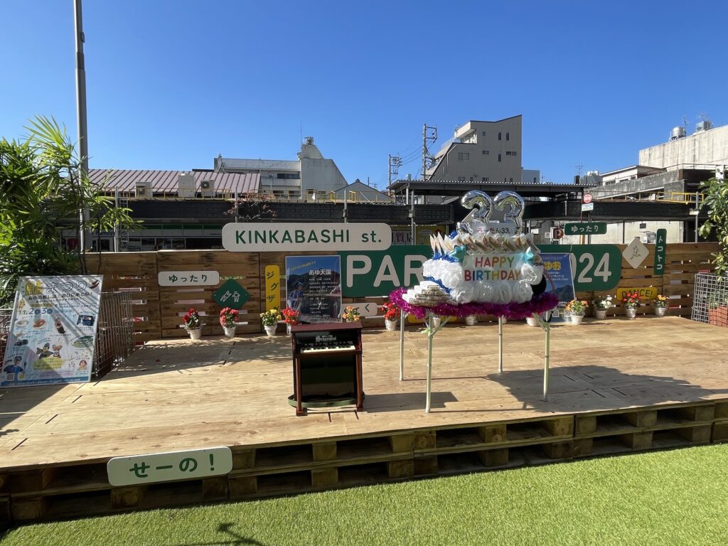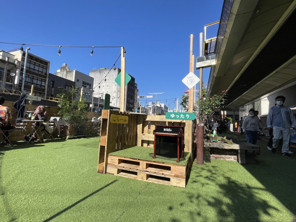 柳ケ瀬の西側にある金華橋通りは、2024年は、社会実験を兼ねて旧岐阜高島屋~柳ケ瀬グラッスル35の南進方向130メートルの東側2車線を歩道と一体化させる社会実験「金華橋ストリートパークライン」を実施中でした。幅11メートルになる「歩道」にはハンモックやテーブル、いす、ビーズクッション、遊具などを置いてくつろげるようなっていて、まるで大きな縁側のようでした。