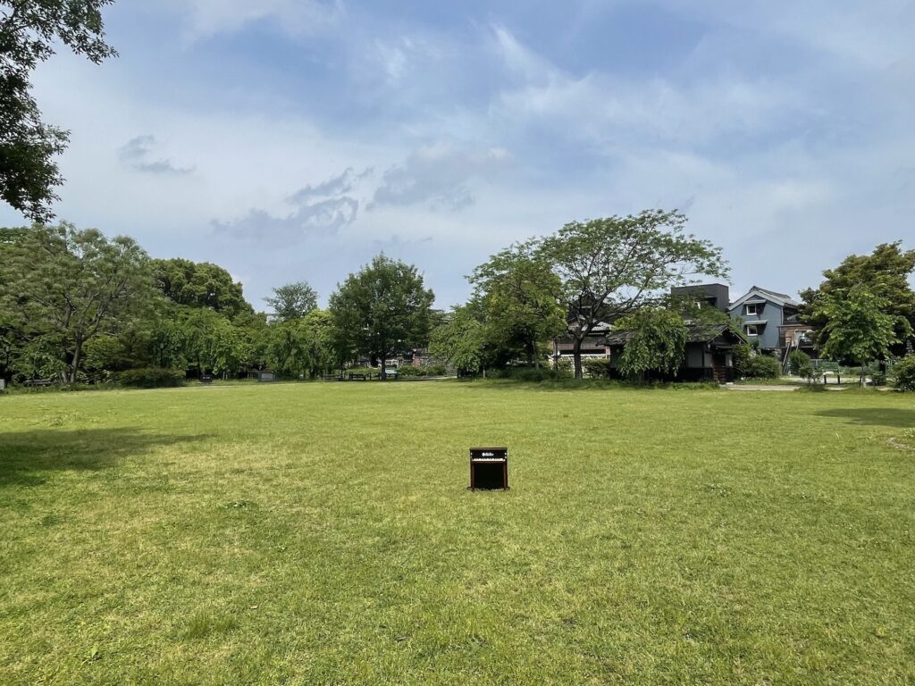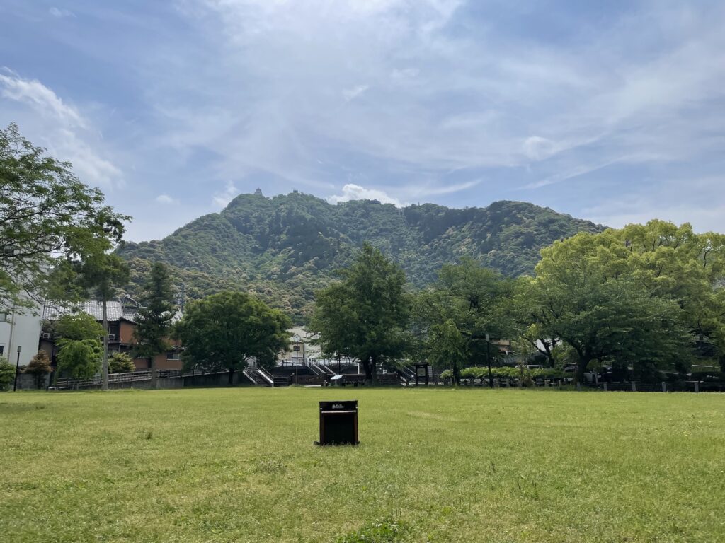 黒い建物に囲まれた細い路地を抜けると、「川原町広場」があります。芝生広場があるだけの、なんてことない公園ですが、振り返ると岐阜城が見える、写真を取りやすいスポットになります。