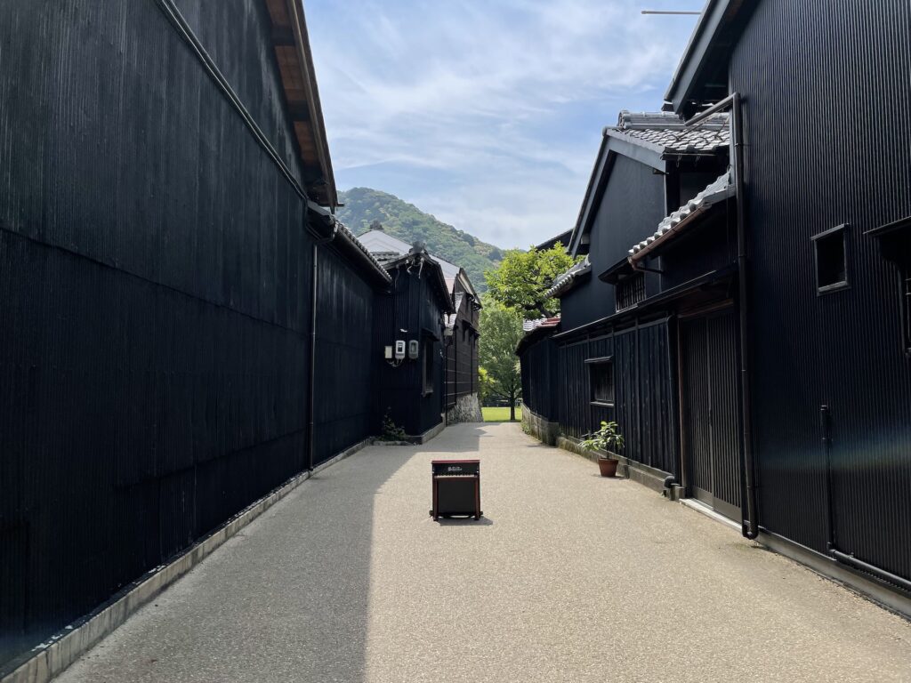 黒い建物が連なっていて、風情があります。建物を少し見上げてみると、「屋根神様(やねがみさま)」と呼ばれる屋根の上に祀られた小さな祠があります。洪水除けや厄除けの意味合いで、昔から商家の屋根に見られます。夕陽に照らされる頃の街並みも素敵です。
