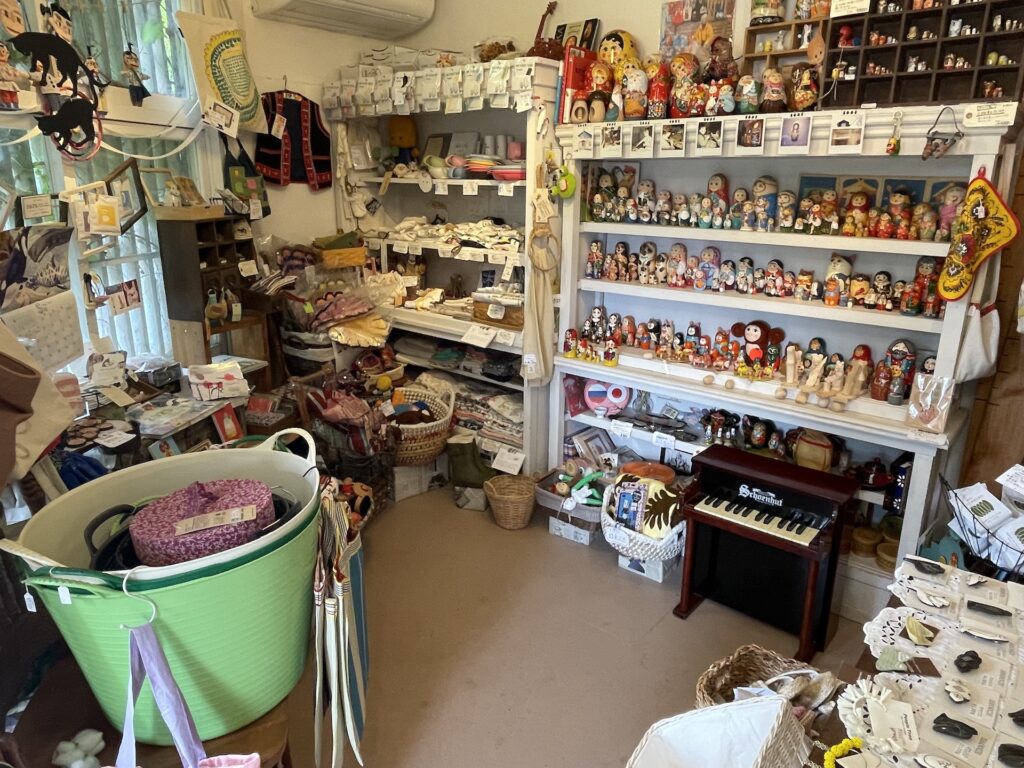 店内にトイピアノを置いても、違和感がありません。棚にはマトリョーシカがいっぱい並んでます。作家さんの展示会や、ワークショップも開催されています。
